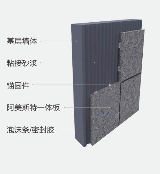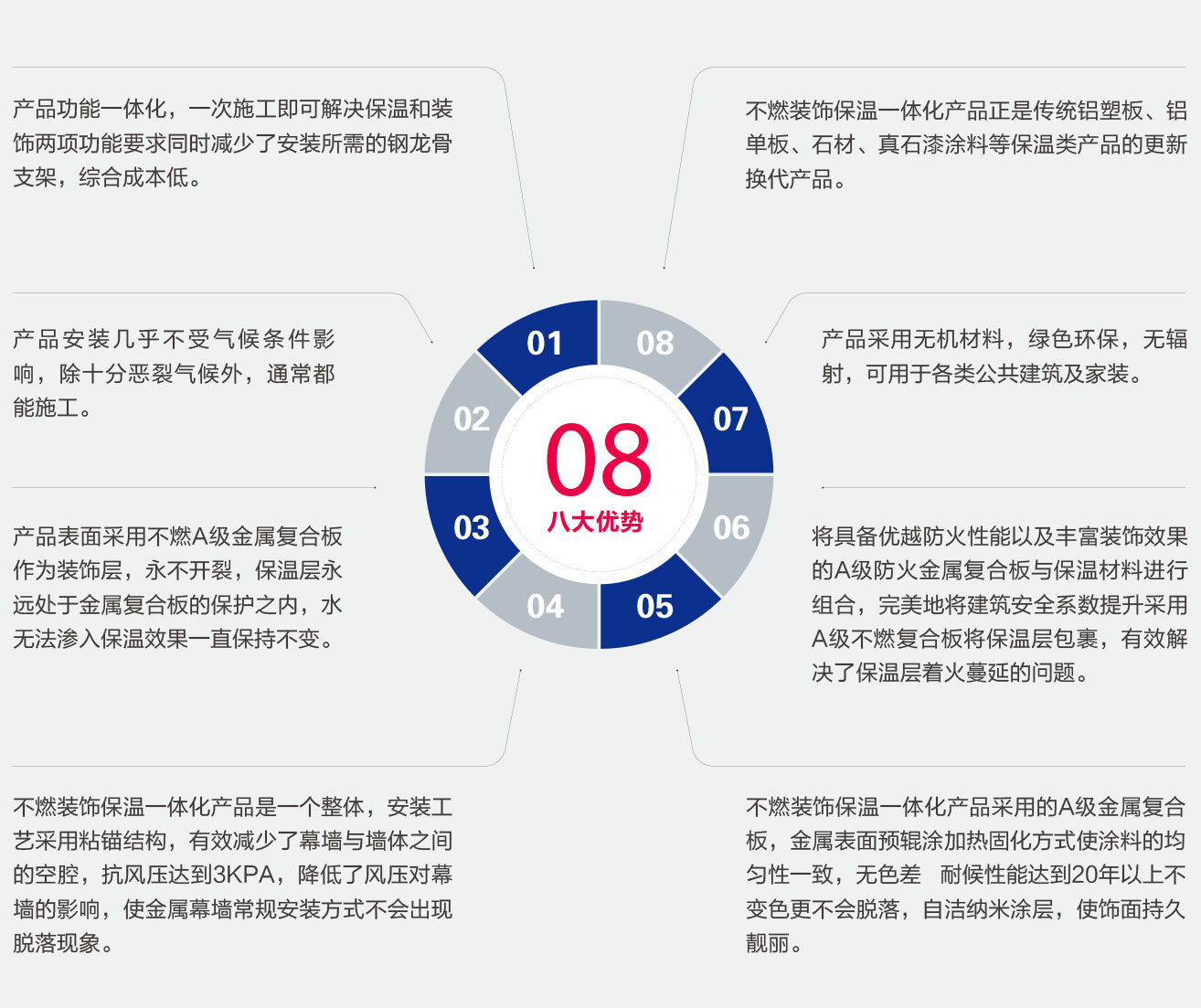 本产品是一款工厂预制,集防火保温及装饰功能于一体的金属一体化板,饰面材料为阿美斯特A级防火金属复合板,保温材料采用A级石墨复合保温板,饰面丰富、保温材料也可以根据设计的要求选择岩棉、石墨聚苯板等其他满足设计要求的保温材料。