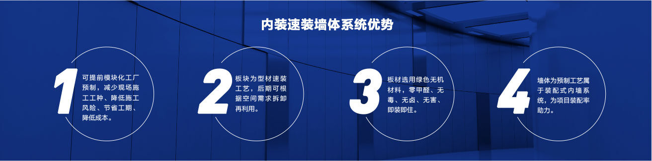 速装墙体主要应用于室内,在工厂组装成型后利用天地龙骨进行固定,优势在于,安装速度快、便于安装和拆卸调整空间、可以提前预制缩短工期。