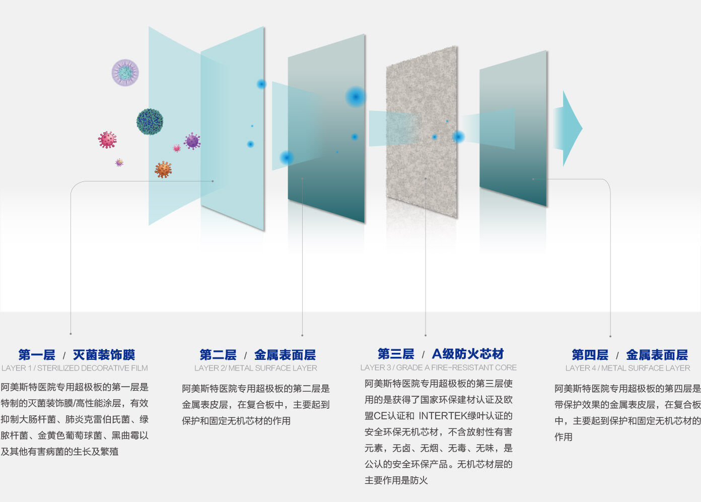 考虑医疗场所的特殊环境要求阿美斯特超极板具有医疗抗菌性能,超极板的性能具备了防火安全、抗菌防霉、耐酸碱、抗腐蚀、无毒、零甲醛等特性,具备的优越性能实现了预控群体性疾病的爆发,成为了医疗场所中一道天然的保护屏障。